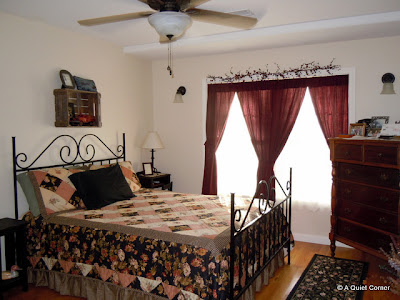The spare bedroom is on the lower level. Well, actually there are two rooms on the lower level that were "bedrooms." However, one of them is now my office! Isn't it great? I love this room. It has a bunch of my favorite things: an antique desk, a chair that belonged to my DIL's grandmother which is sooooo comfortable, my wooden goose named Sovereign, an antique trunk that the Pres found and an antique record cabinet to name a few. The closet in this room is another six footer and the Pres added some extra shelves for me for storage.