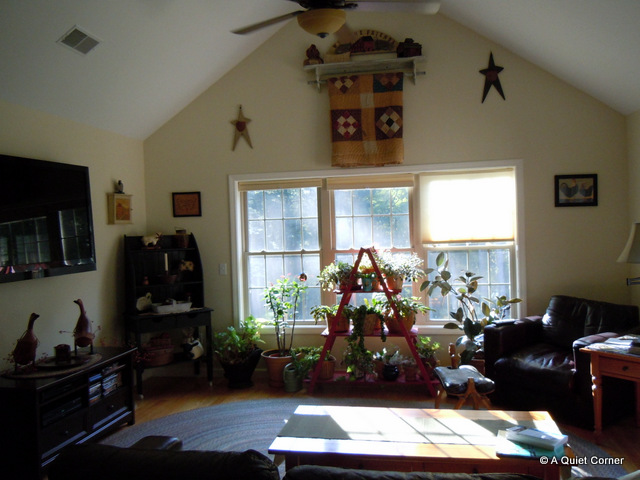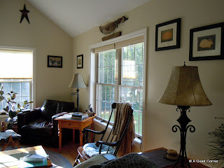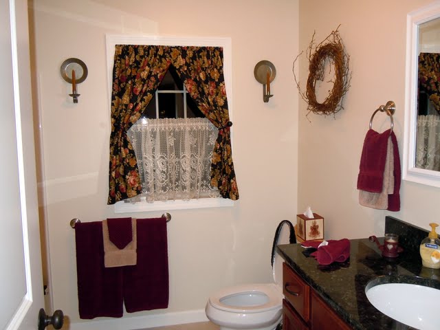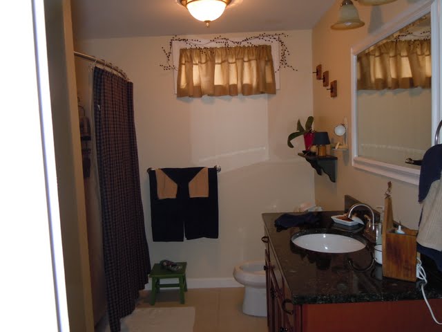 Funny story about the curtains in the master bathroom. I have a Waverly patterned comforter for the bed and one year...oh, several years ago, I remarked to my sister-in-law how much I loved her tablecloth. The next thing I knew she pulled it off the table, explained to me that it was simply a piece of material with the salvage edge, folded it up and set it on top of my purse. When I returned to Virginia and unpacked my suitcase, there it was. Now it was clear WHY I admired it so. It was my Waverly pattern in my comforter! The rest is simple...I made curtains out of it, mainly to always remind me of Nancy!
