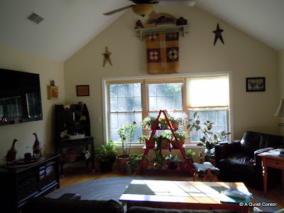 Can you see these two lace panels below the granite room divider in this picture? They are "shoe cubbies". I lined them with rubber non-slip mat. It's a convenient place to put your shoes when you come in the front door or stash your garden shoes. It's also a great place to store hats, scarves and gloves.